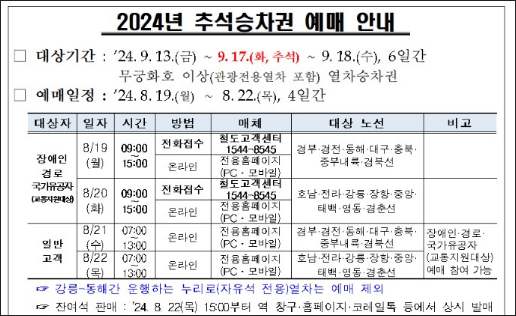 - 8월 21일 (수): 이제 일반인 예매가 시작되니, 경부선, 경전선, 동해선, 대구선, 충북선, 중부내륙선, 경북선 등 여러분이 이용할 노선을 미리 준비하세요!