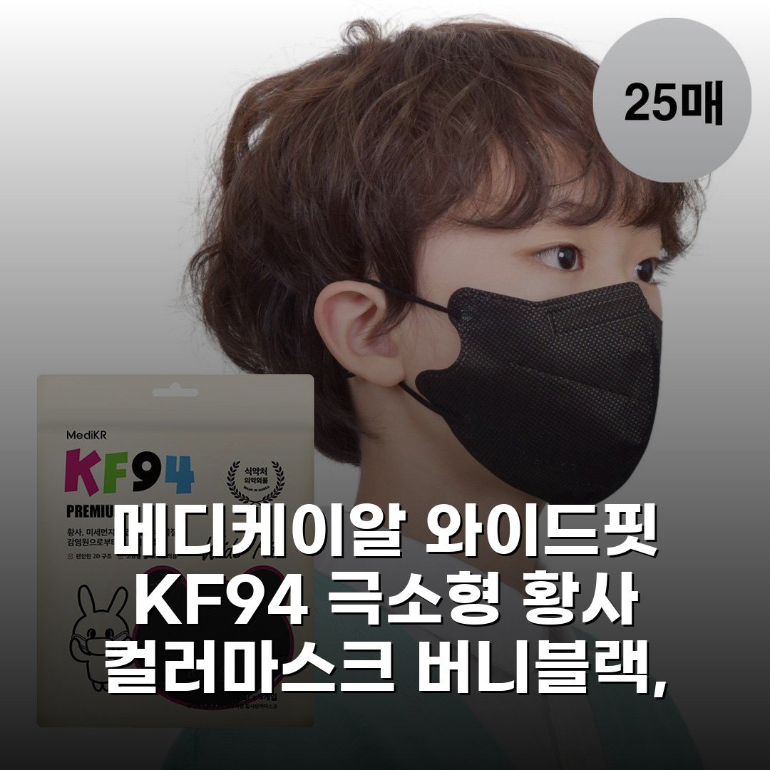 메디케이알 와이드핏 KF94 극소형 황사 컬러마스크 버니블랙 25매. 편안한 착용감과 뛰어난 필터링으로 황사와 미세먼지를 완벽 차단하세요.